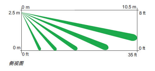 探测器安装高度为 2.4 米(8 英尺)时,探测范围直径为 12 米(40